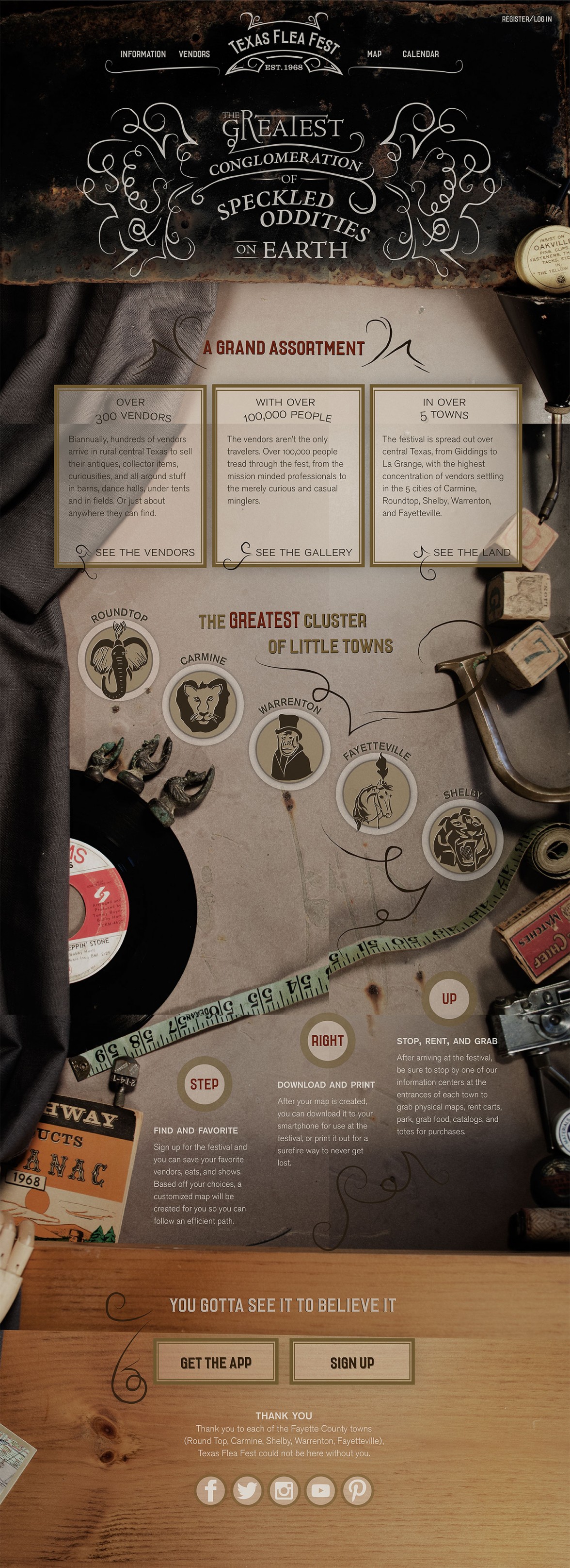 We created brand imagery that united the festival and positioned the festival as a catch-all flea market where attendees can find anything imaginable. Through the website, and way finding system, we provided easy-to-use resources for navigating the Texas Flea Fest.